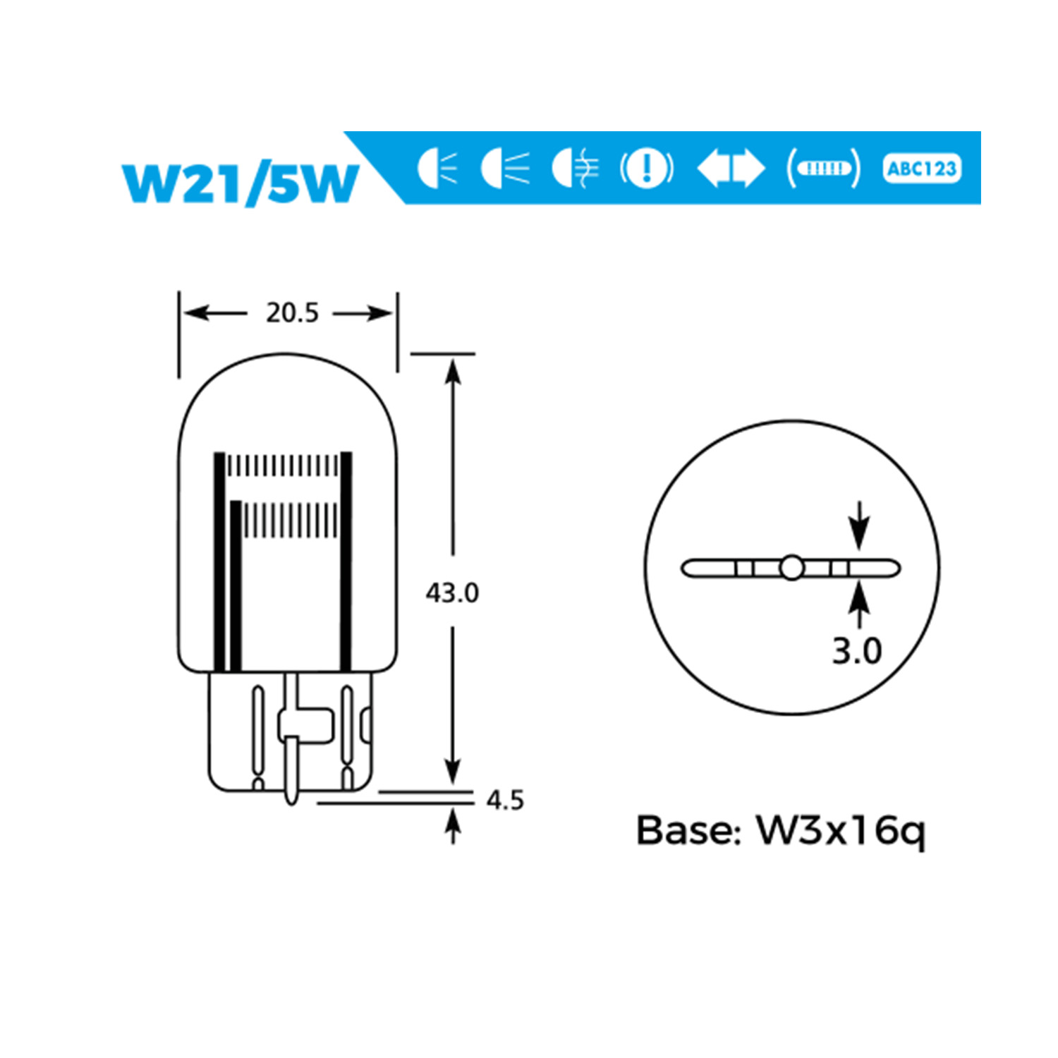 12V 21/5W W21/5W bulbs suitable for brake and tail light applications. Twin pack blister.