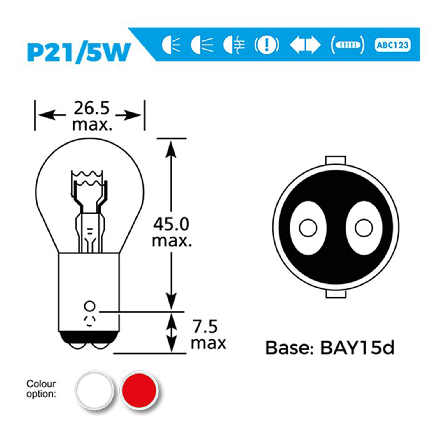 12V 21/5W DUAL FILAMENT BULB — Suitable for stop and tail light applications.