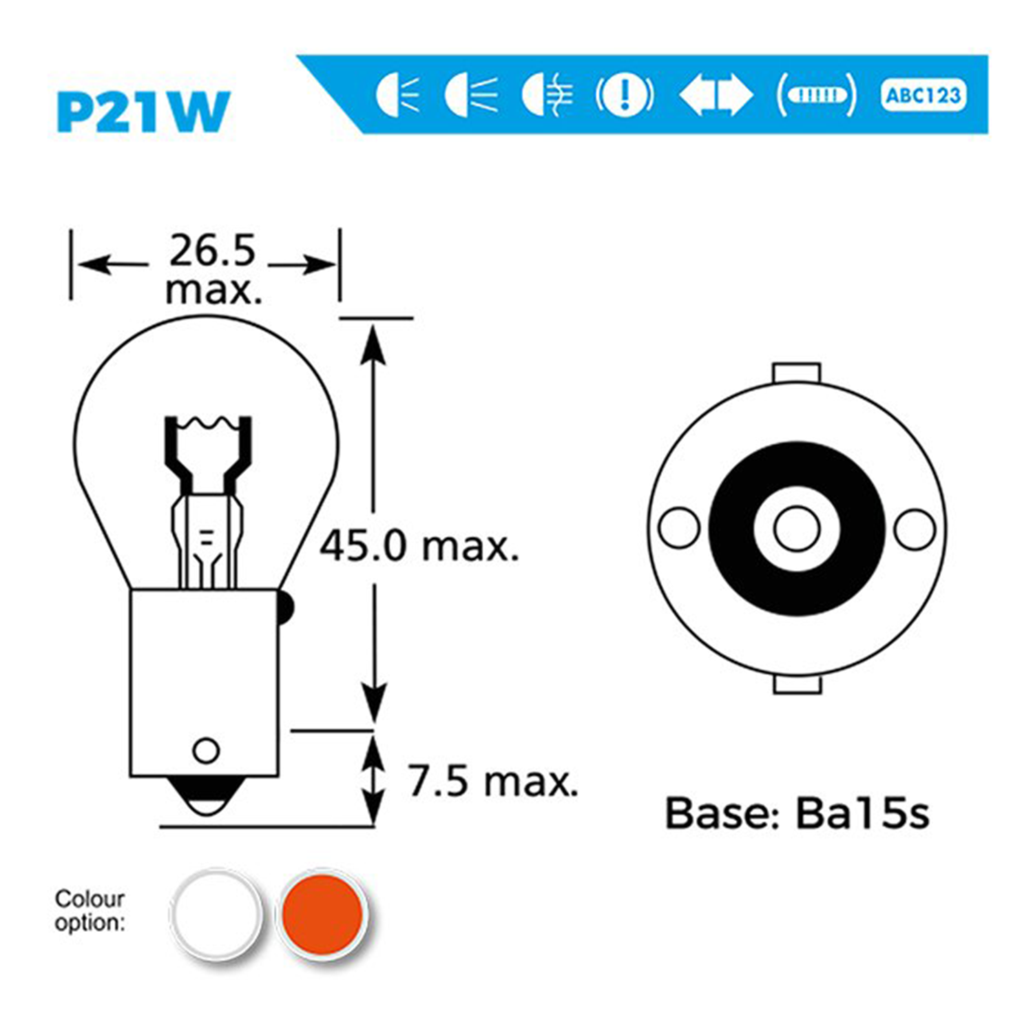 12V 21W BA15s single-contact bulb suitable for brake or indicator applications. OEM replacement supplied in blister packaging.