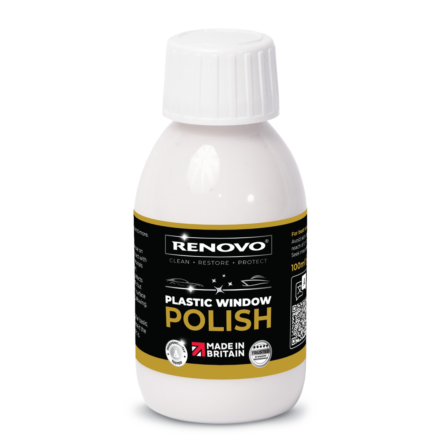 1. Prior to the application of Renovo Plastic Window Polish ensure that the window is clean and free from dust particles by washing with a soft cloth and warm water. It is not advisable to use cleaning detergents on plastic windows.