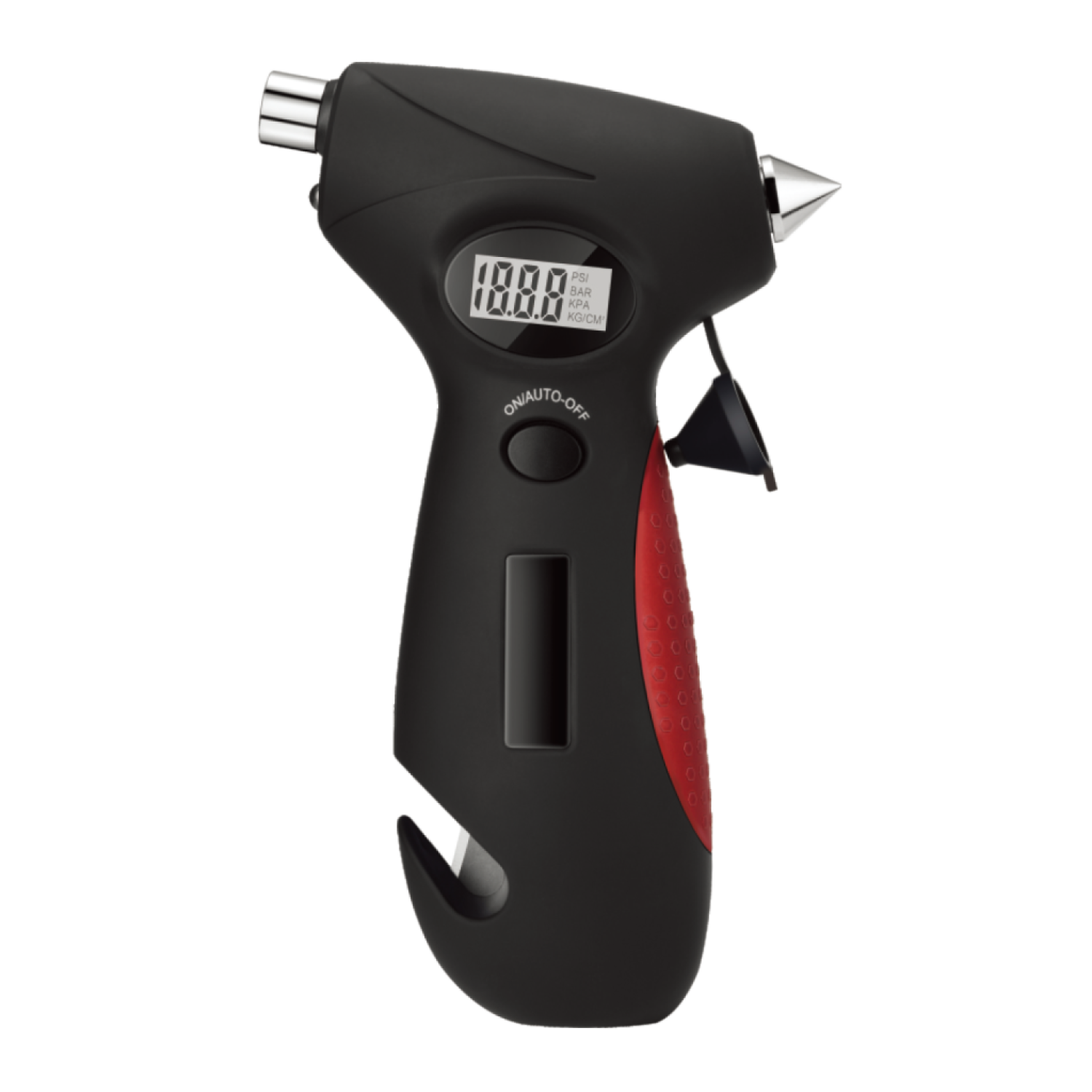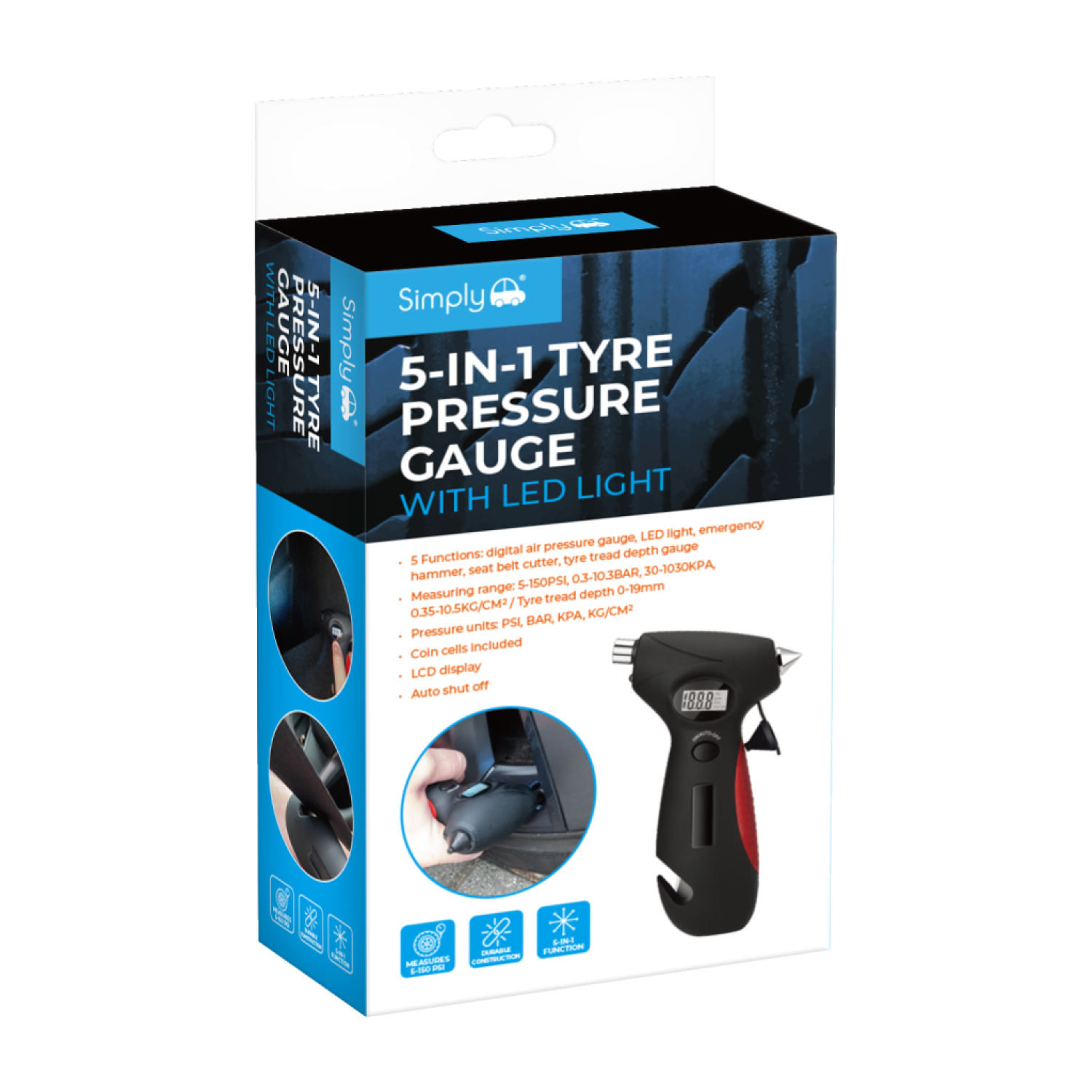 - 5-IN-1 MULTI-TOOL — Combines tyre pressure gauge, seatbelt cutter, LED torch, red emergency light, and window breaker.