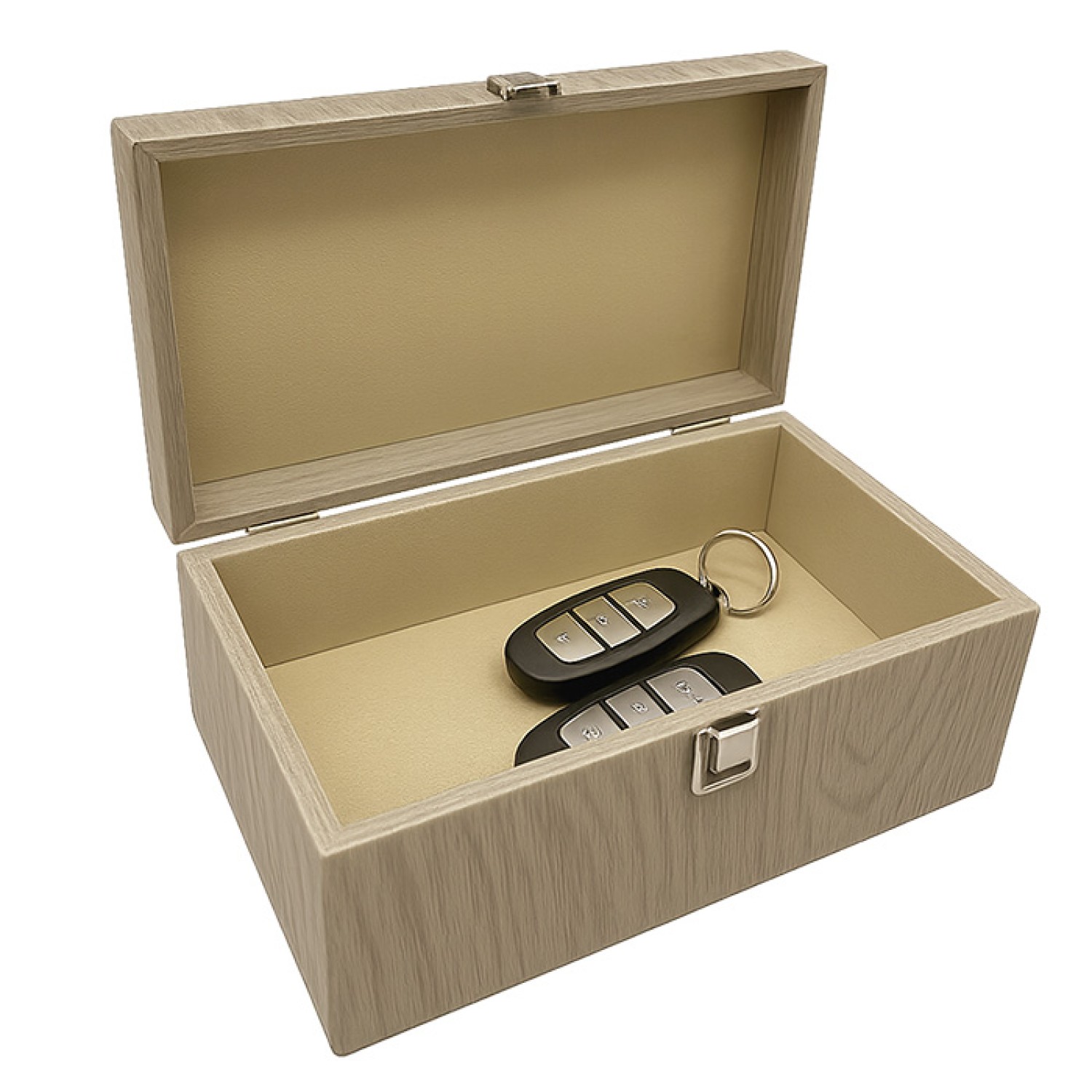 Keep your car keys secure with the Large Oak Faraday Box. Featuring a wood-effect finish and signal-blocking lining, it protects against keyless entry theft in a stylish, compact form.