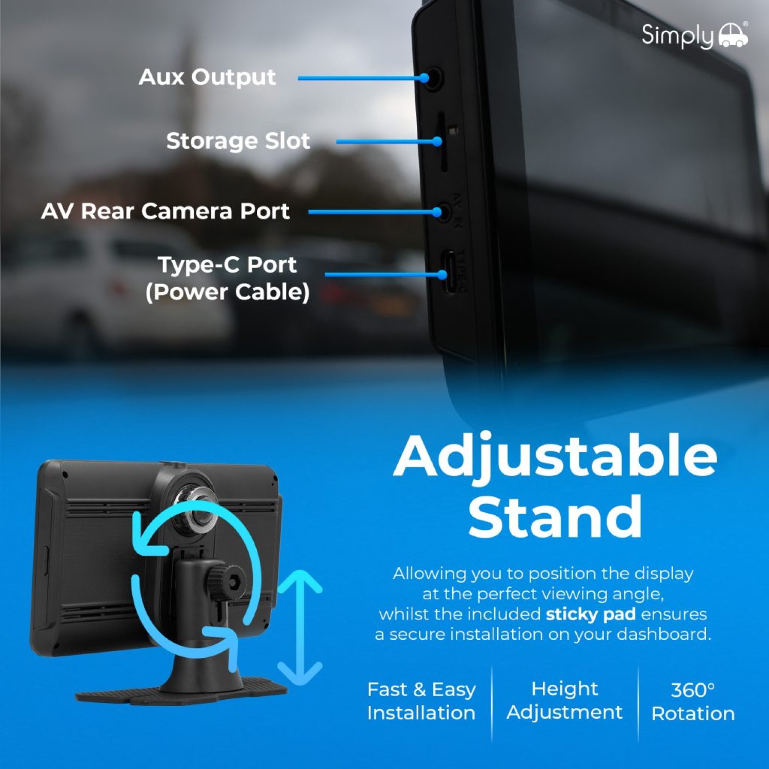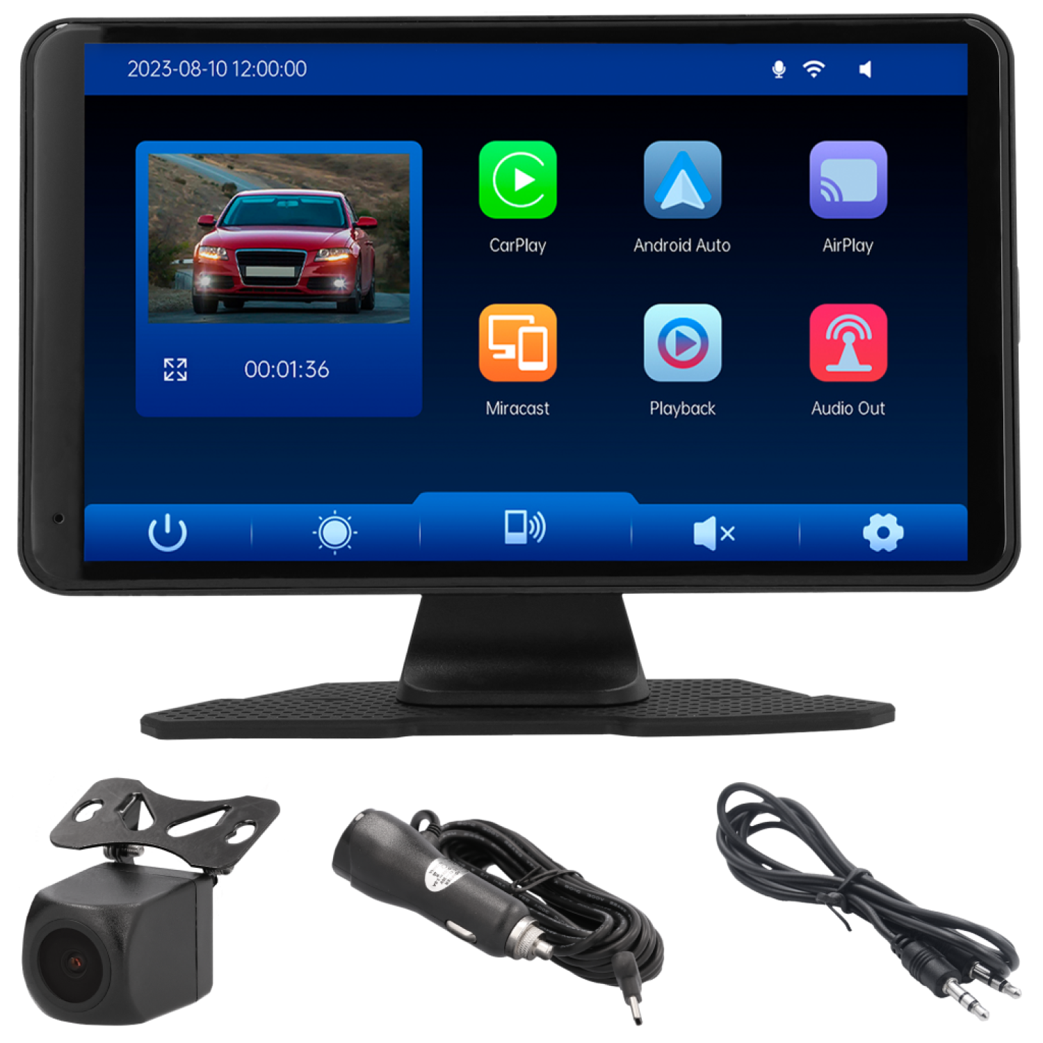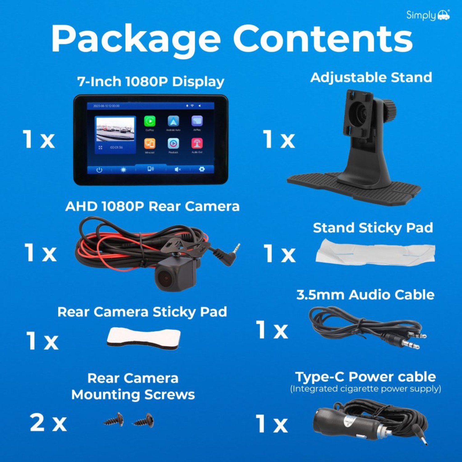 - COMPLETE INSTALL KIT INCLUDED — Includes 7-inch display unit, integrated front camera, AHD 1080P rear camera, adjustable dashboard mount, rear camera bracket, adhesive pad, mounting screws, 3.5mm AUX cable and Type-C cigarette lighter power cable.