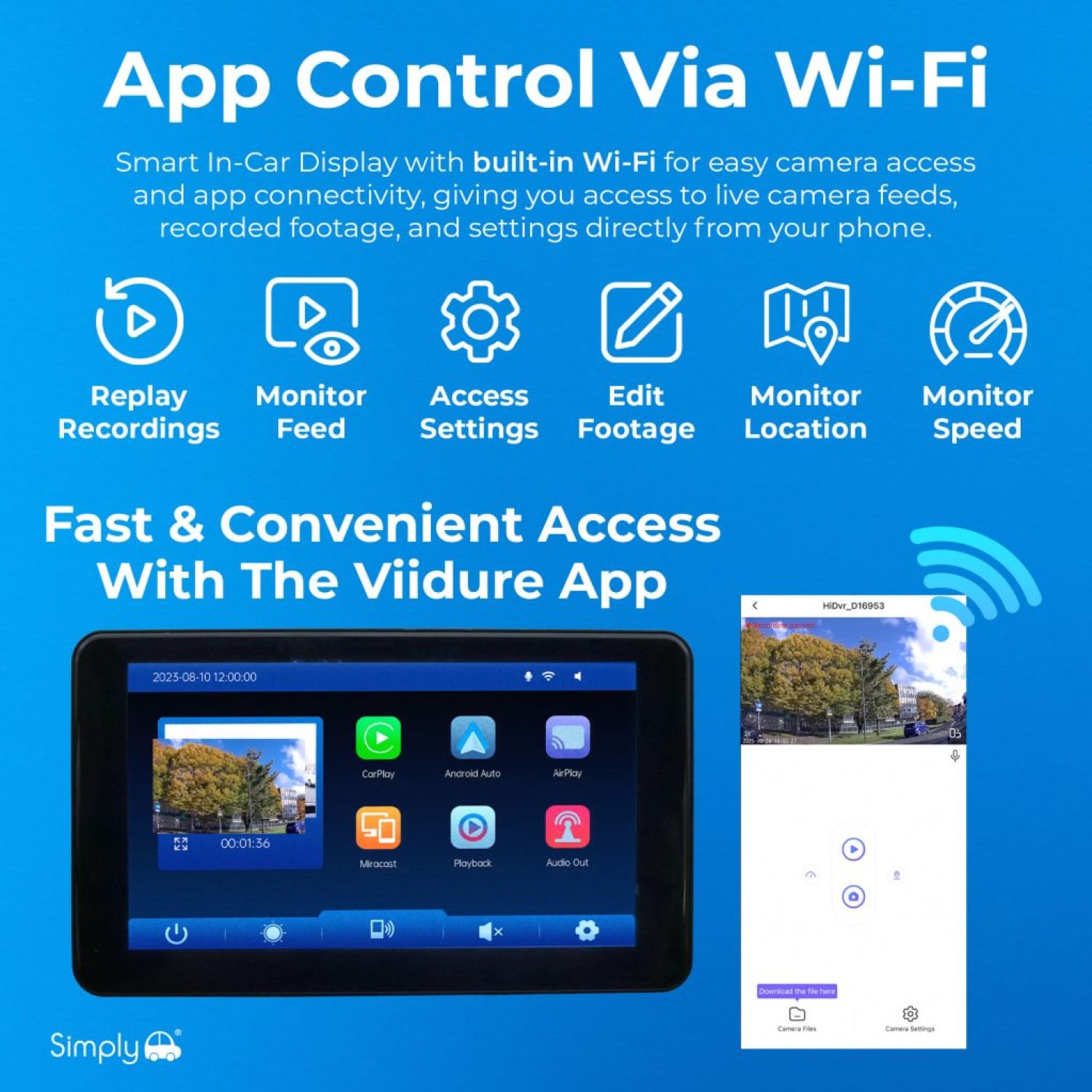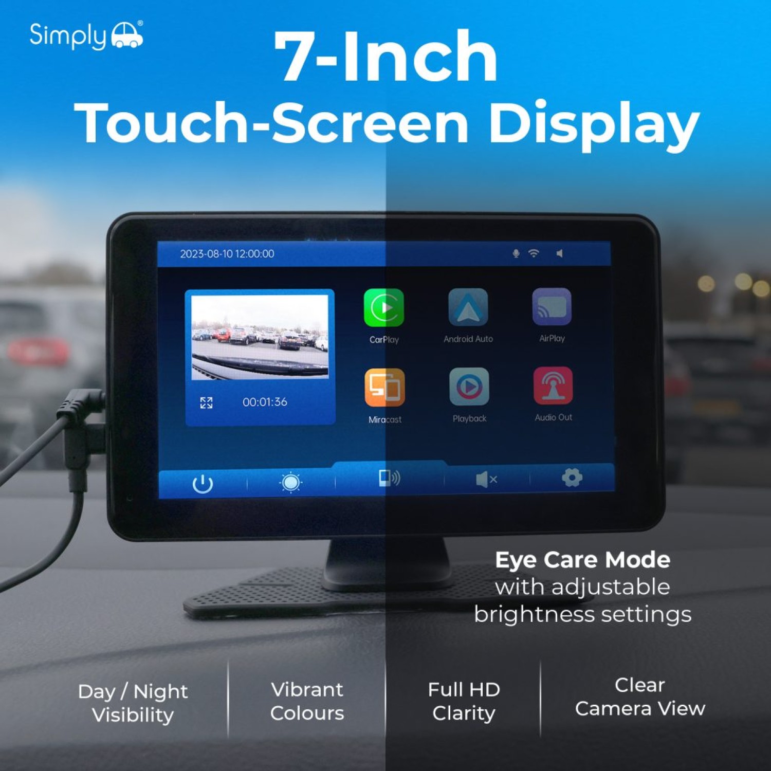 The ultimate smart in-car display — combining wireless Apple CarPlay® and Android Auto™ with dual Full HD 1080P front and rear camera recording. Capture every journey for complete peace of mind, while enjoying seamless smartphone connectivity on a clear 7-inch touch screen.