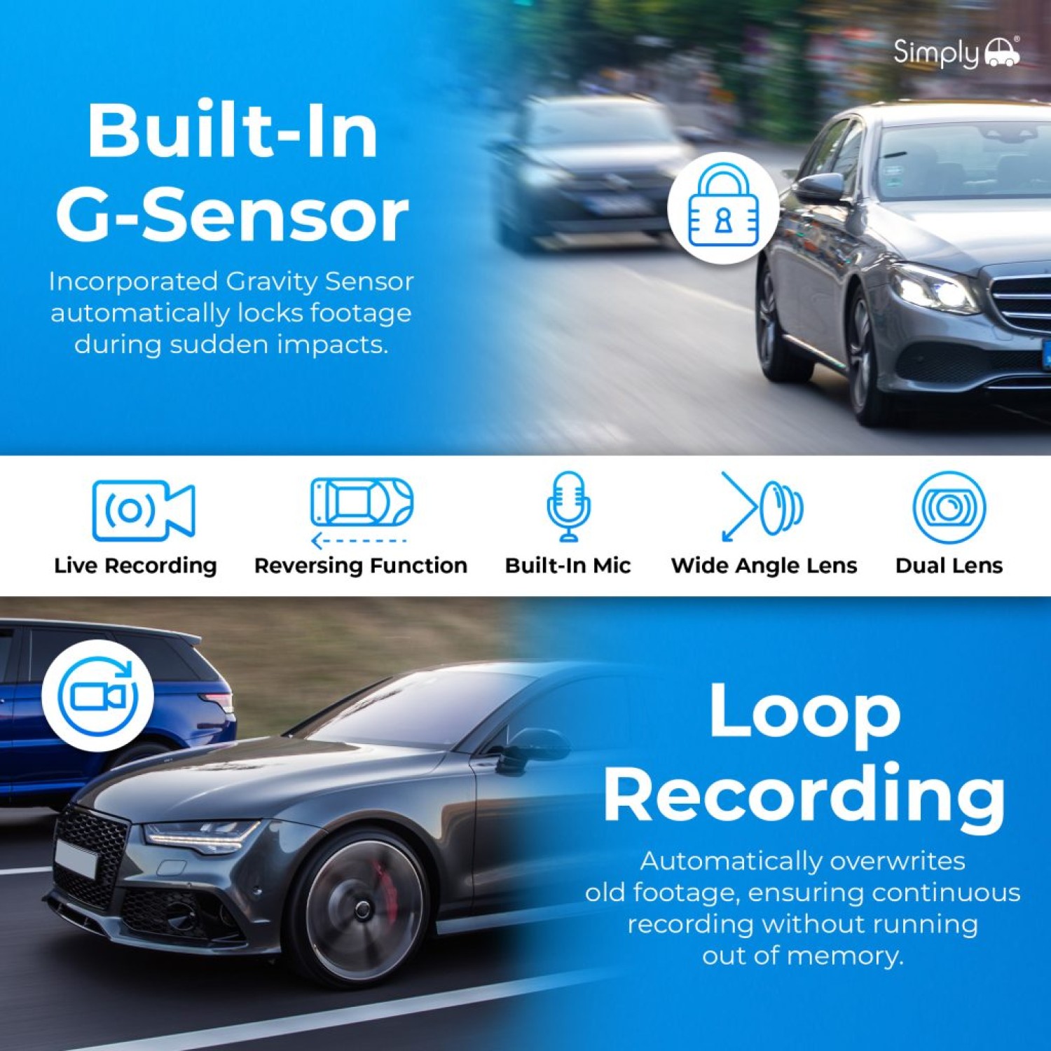- BUILT-IN G-SENSOR — Automatically detects impacts and sudden movements, locking critical footage so it cannot be overwritten during loop recording.