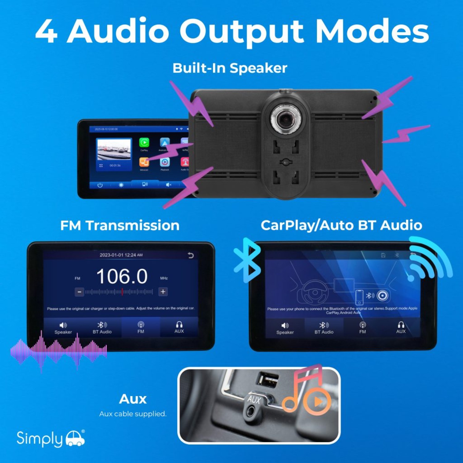- FLEXIBLE AUDIO OPTIONS — Built-in speaker, FM transmission, Bluetooth audio or 3.5mm AUX to suit any vehicle audio system.