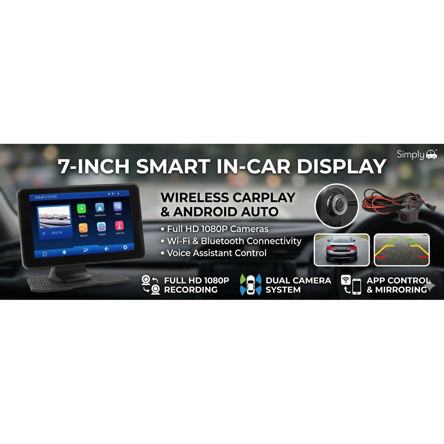 The ultimate smart in-car display — combining wireless Apple CarPlay® and Android Auto™ with dual Full HD 1080P front and rear camera recording. Capture every journey for complete peace of mind, while enjoying seamless smartphone connectivity on a clear 7-inch touch screen.