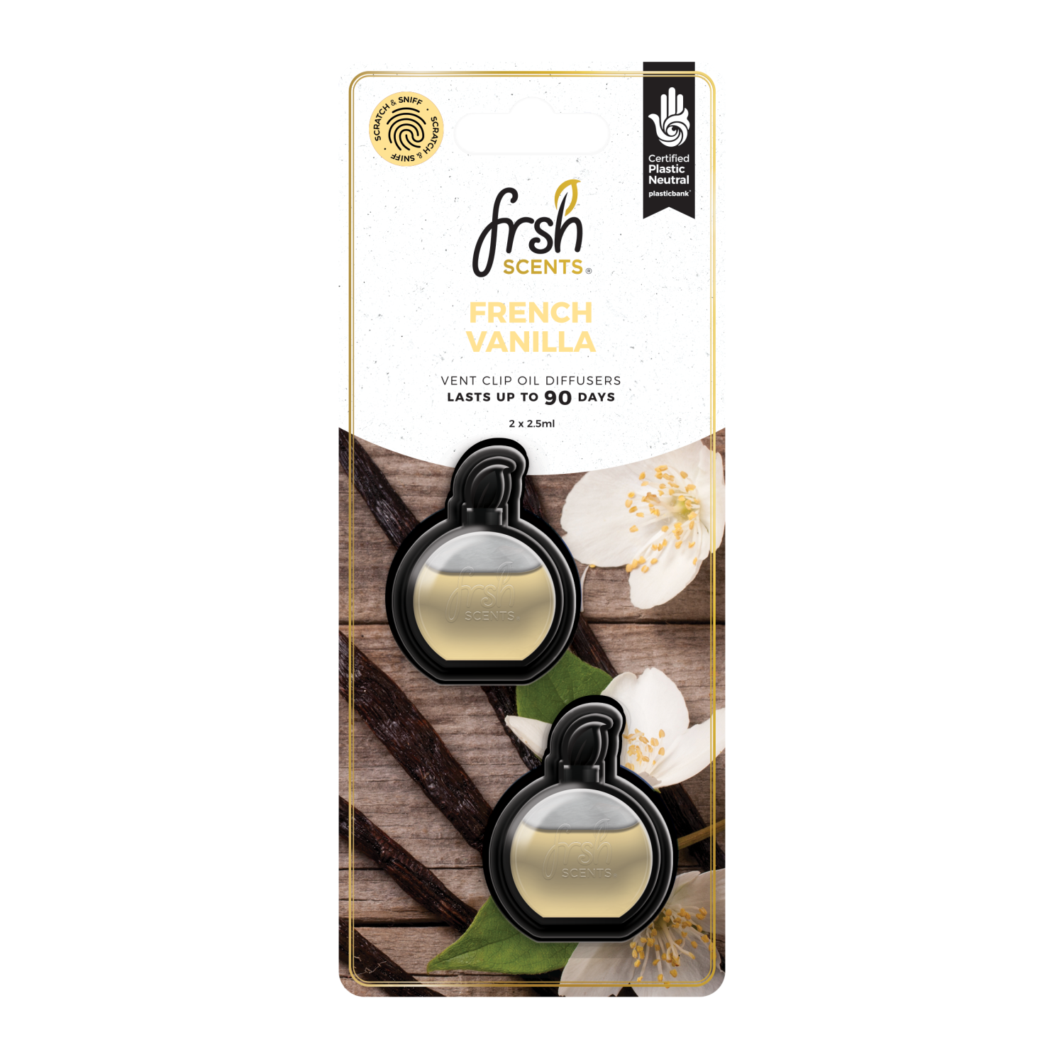 Frsh Scents French Vanilla Vent Clip Oil Diffusers. Twin pack (2 x 2.5ml). Lasts up to 90 days. Certified Plastic Neutral.