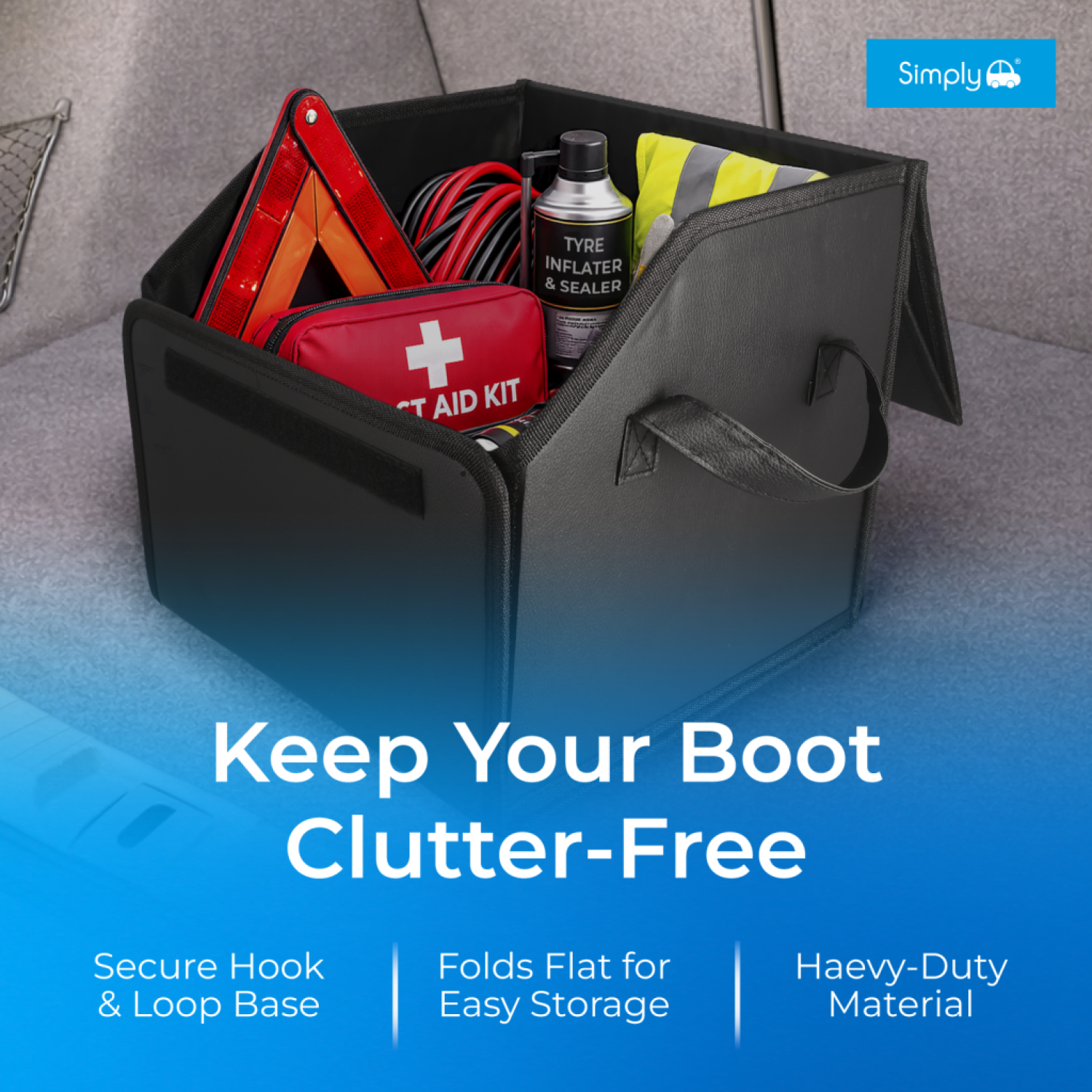 Foldable boot organiser that keeps loose items contained and prevents them rolling around — sets up in seconds and folds flat for storage when not in use.